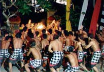 バリは最近もう大流行だから、こういう光景を見たことも多いだろう。ケチャックダンスを踊っている男わらわらである。夕暮れから夜にかけてココナツオイルの炎の周りにあつまって男がわらわら「ちゃちゃちゃ」(加藤茶じゃないぞ)とリズムをとりながら徐々にクライマックスに向かっていくドラマチックな儀式である。これを見ていると単純に元気になる。「リズムのあるわらわら」って人間を元気にするなあ、と思うのだ。プラスのわらわら。たとえばオーケストラとかもそうでしょ、あとダンスグループとかいろいろ、マックスとかスピードも。それに対してリズムのないわらわらっていうとサラリーマンの通勤風景でしょ、学校の授業の光景でしょ、えーとそれから、お盆帰りの渋滞もそうだ! 結局生気がなくてリズムのないわらわらって、ブラックホールみたいに人間のエネルギーを吸い取るね。毎日通勤通学列車に乗っている人はそれだけでエネルギー吸い取られているはず。マイナスわらわら。みんなそういうマイナスな気分をどこで補充しているのかな? 正直先生はバイクでそれを解消しているけど。それともみんな自分がプラスな気分を味わったことがないからマイナスだって気がつかないのかな? そんな人はこのケチャわらわらを見てみるべきだよ。
