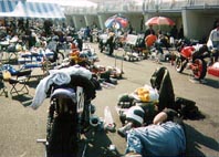 これは先日行った筑波サーキットのバイク草レースのピット裏である。ここにはもうこんなにしょーもないバイク好きがいるんかい! というほどにわらわらとバイク、そしてバイク好きな男たち。つなぎを脱ぎ捨てたアホがそのへんにごろごろと転がっている。でも、不思議に女性はいないんだな。もちろんライダーの彼女とか、観客には女の子はいるのだが、マシンをいじっている女性やレースに出ている女性はみかけなかった。あ、いじっている女性は一人いたな。先生がバイクを買ったショップのメカに一人。