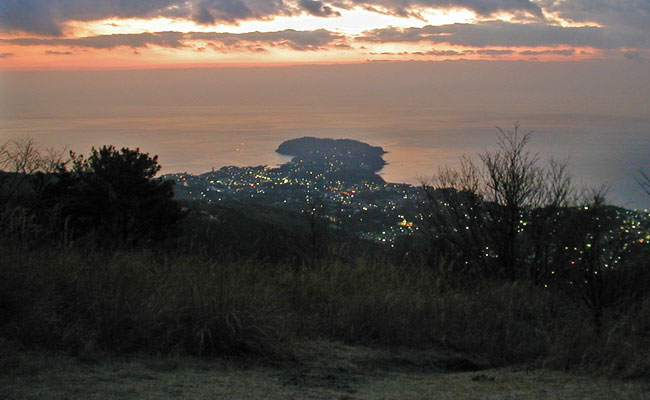 今年最初のミッドナイトハイクのツアーは、3月2日土曜21時45分から翌日3月3日日曜朝まで。南箱根の溶岩ドーム、約15万歳の幕山(標高626m)とそれに連なる南郷山(標高611m)に登ります。闇と夜梅と旧暦正月二十六夜の月の出と金の出、それに、幕山たちと同期(約15万歳)の真鶴半島や相模湾、伊豆諸島等々の素晴らしい展望を、少人数でたっぷり楽しみます。